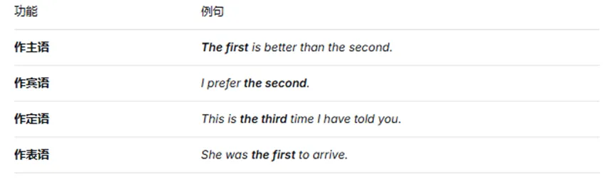 序数词跟基数词的区别在于,基数词是数数,比如1,2,3,100等等,而序数词是排序,也就是第一,第二,第三,第100,前者用来计数,后者用来排队