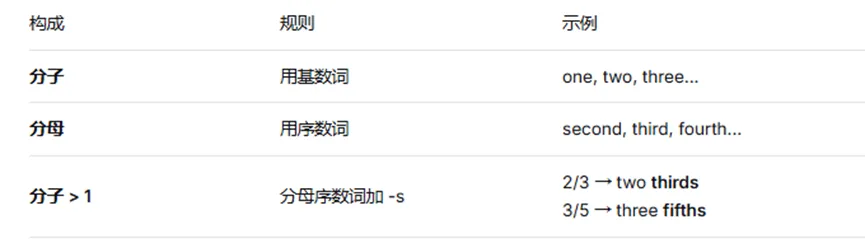 - 正确表达分数:分子基数分母序数,分子大于1分母加-s
