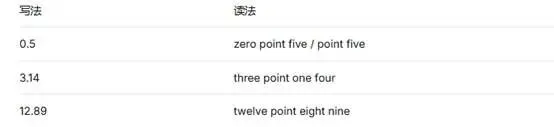 注意:小数点后的数字按个位依次读出,不用基数词规则。
