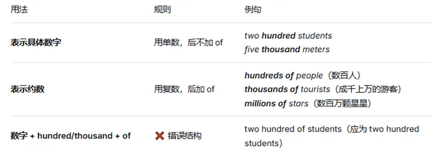 - 掌握 hundred/thousand 等词的用法:有数不加s,无数加s 加of