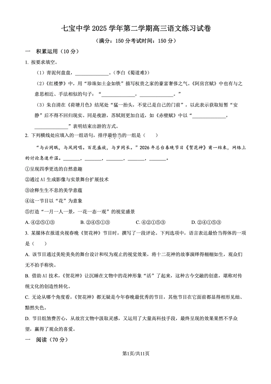 【七宝中学】(可下载word)上海市七宝中学2025-2026学年高三下学期语文3月月考试题