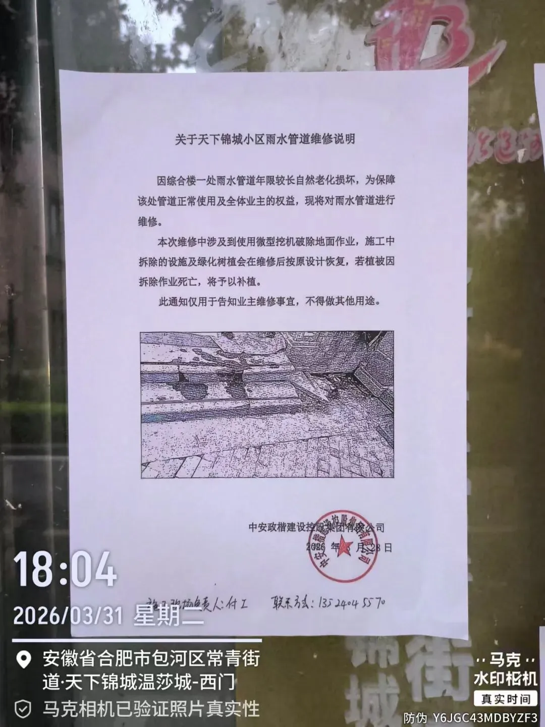 本次维修中涉及到使用微型挖机破除地面作业,施工中拆除的设施及绿化树植会在维修后按原设计恢复,若植被因拆除作业死亡,将予以补植。