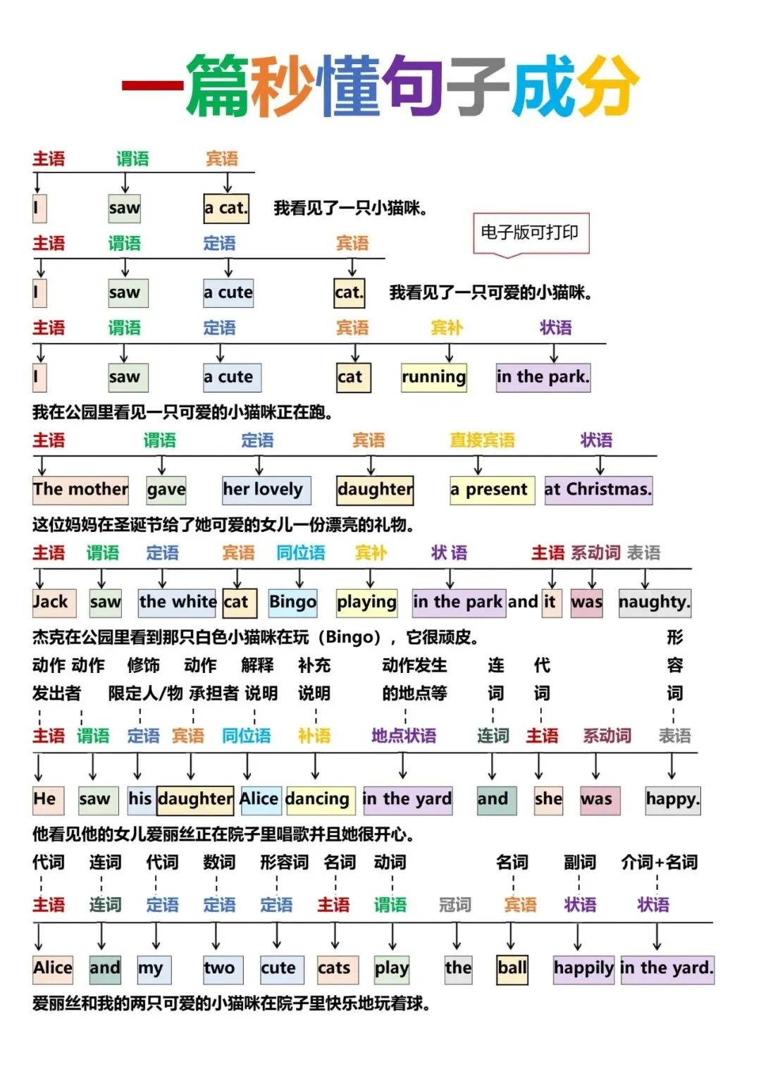 英语语法总结 一篇秒懂句子成分 ,仅显示部分页面,完整电子版文末有打印方法。