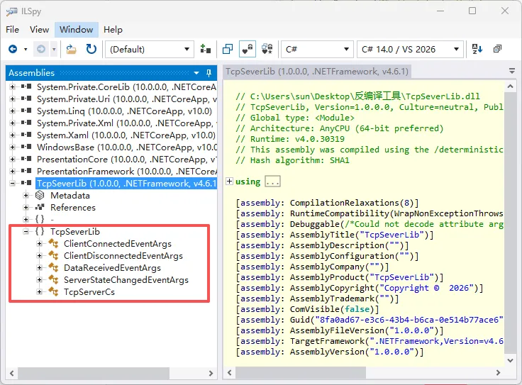 加载完成后,左侧「Assembly Explorer」(程序集浏览器)中,会显示该文件的所有命名空间、类、方法,展开即可查看结构。
