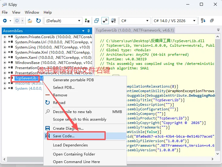在左侧选中需要导出的命名空间、类或方法;右键点击,选择「Save Code」(或快捷键Ctrl+S);