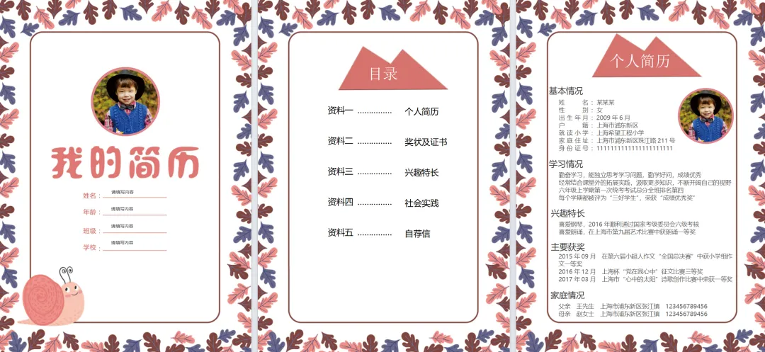 小学生创意蜗牛小升初简历Word