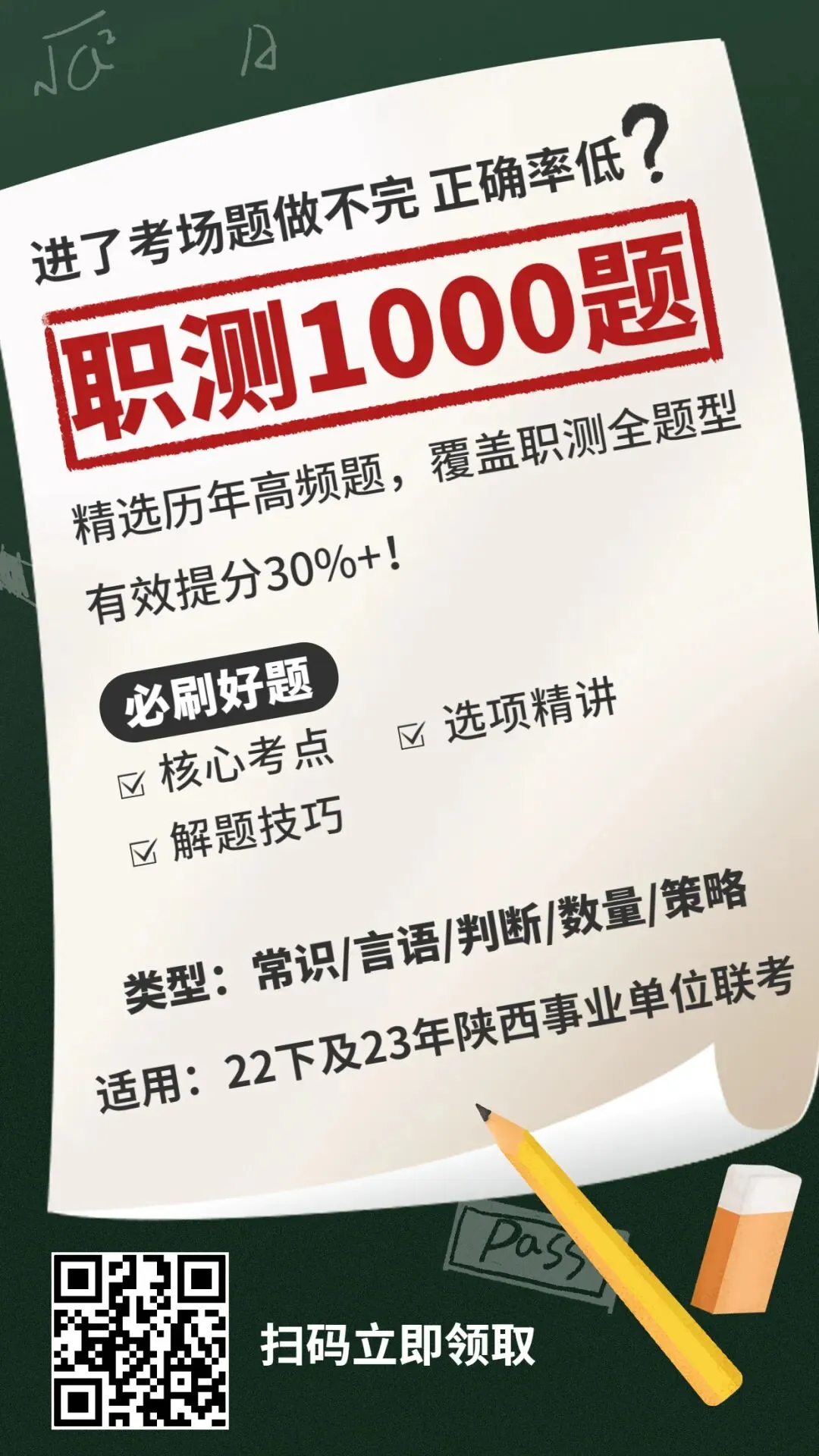 【刷题】《职测1000道模块练习题》免费下载! 22年下半年陕西事业单位招聘教师公告 倒计时17天 时刻准备着 一刻不敢松懈! 陕西招教科目一:职业能力倾向测验 全方位夯实基础,核心考点全都拿下 多角度练习笔试,重难习题一网打尽 名师逐题讲解析,带你走出失分重地 时间真的紧迫! 参加22年下陕西招教考试的考生们 立刻扫描下方二维码 下载1000道精研必刷题 扫码进群,立即查看 (陕西联考53群,群满点击阅读原文) 戳“阅读原文”,查看近期公告及岗位表! 点点再看,考编一次上岸
