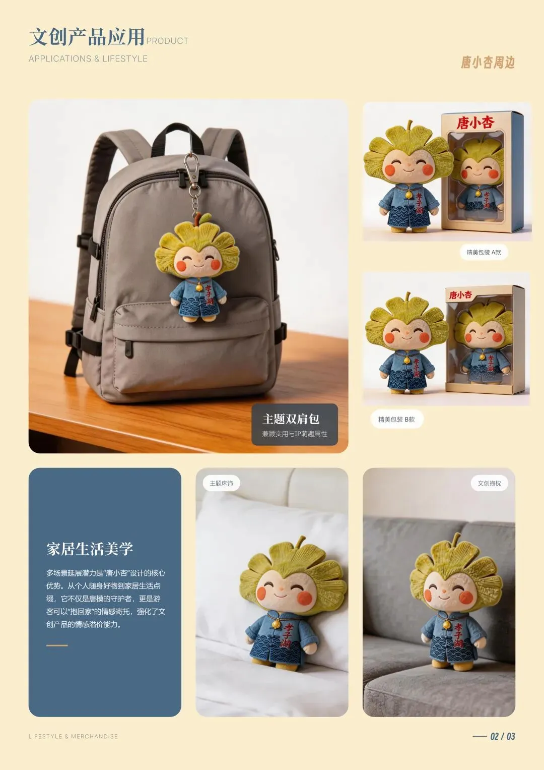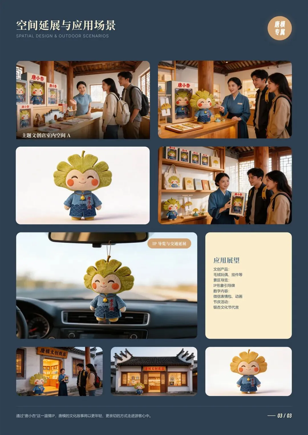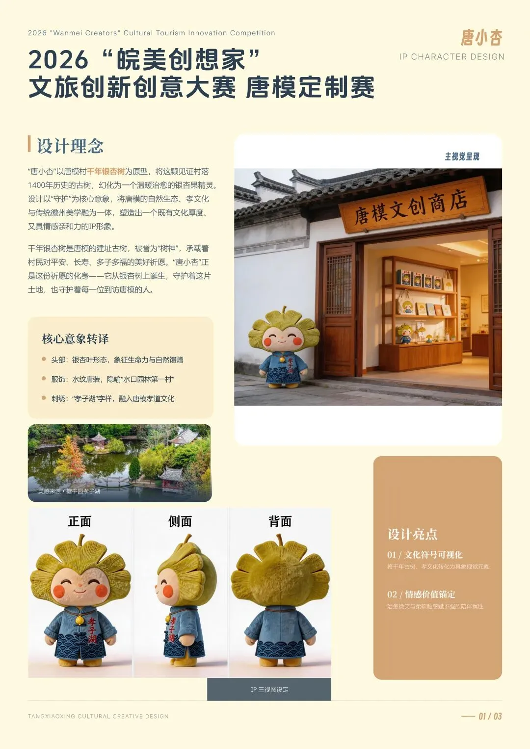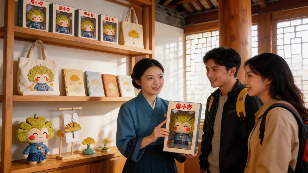 “唐小杏”以唐模村千年银杏树为原型,将这颗见证村落1400年历史的古树,幻化为一个温暖治愈的银杏果精灵。设计以“守护”为核心意象,将唐模的自然生态、孝文化与传统徽州美学融为一体,塑造出一个既有文化厚度、又具情感亲和力的IP形象。