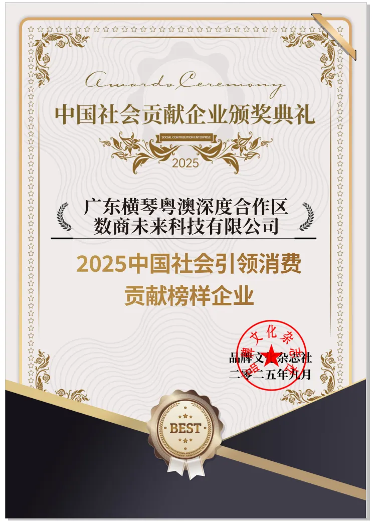 在由浙江省人民政府和商务部联合主办,杭州市人民政府、浙江省商务厅和商务部外贸发展事务局共同承办的第四届全球数字贸易博览会论坛活动区,由品牌文化杂志社主办的“2025中国社会贡献企业颁奖典礼”如约举行,DIGICOMS数智生活旗下的广东横琴粤澳深度合作区数商未来科技有限公司凭借其领先时代的数智无忧生活APP,荣获 “2025中国社会引领消费贡献榜样企业”殊荣。