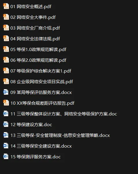 今天重磅奉上【网络安全等级保护(等保)全套资料文档】,共15份,内容全面、分类清晰、实战落地!