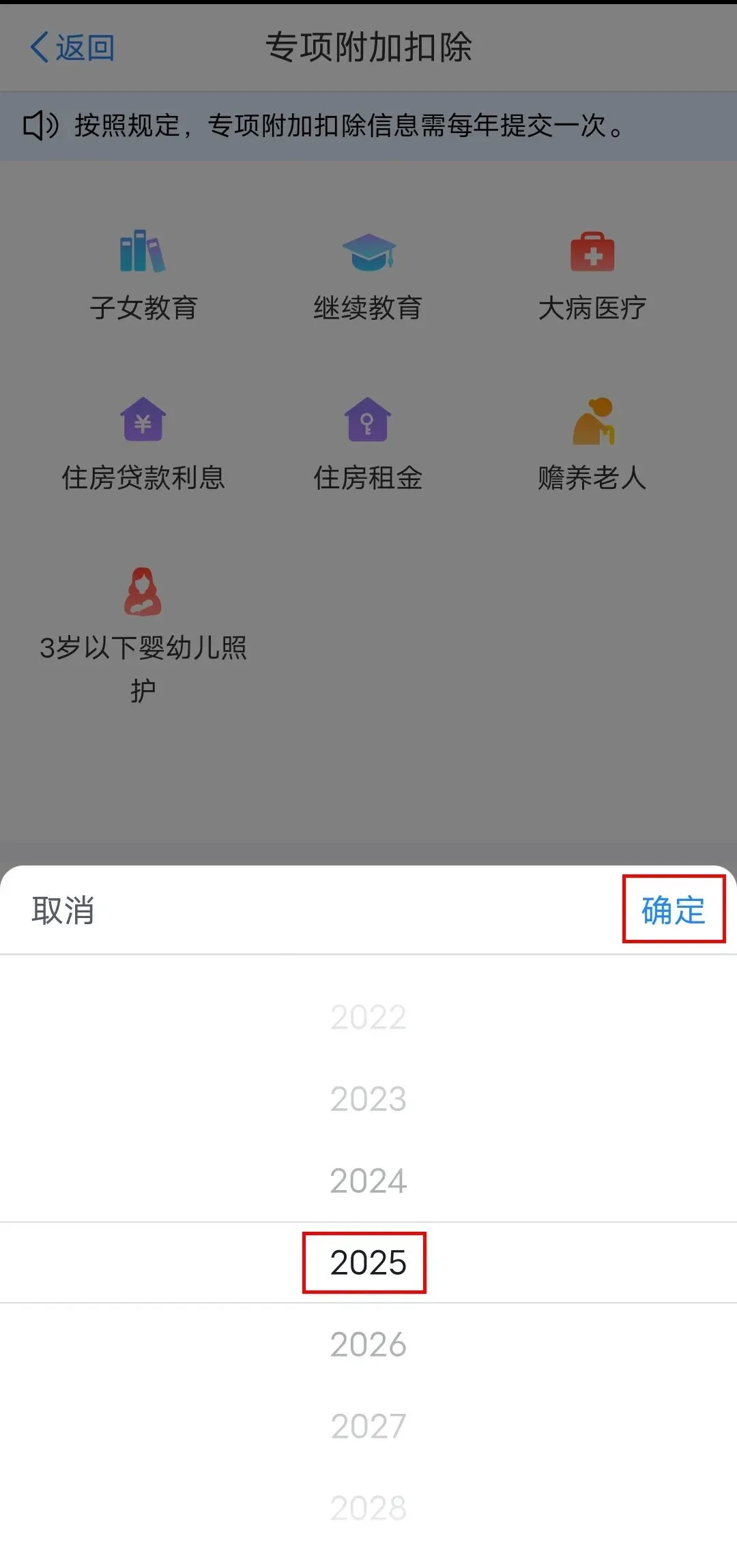 1.登录个人所得税App,依次点击【办&查】-【办税】-【专项附加扣除】,在【选择查询年度】选择“2025”后点击【确定】。