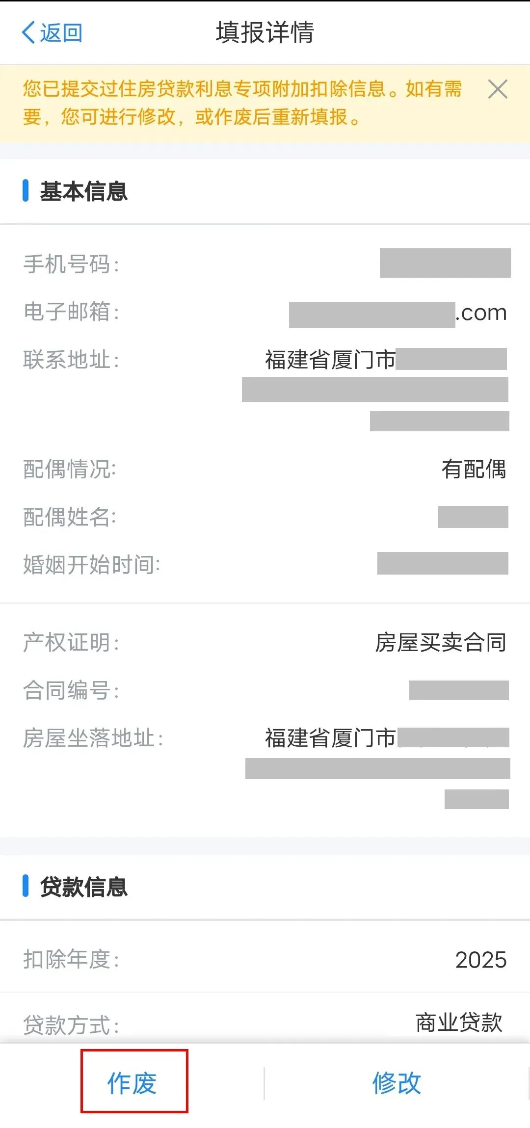 2.在填报记录选中【住房贷款利息】进入页面,点击【作废】。