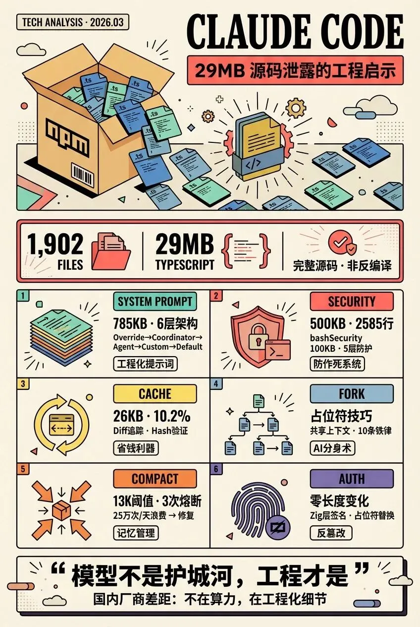 2026年3月31,Anthropic 的编程助手 Claude Code 爆出了史诗级泄露。一个本该被编译混淆的 npm 包,居然忘删了 source map 文件。结果?1902 个源文件、29MB 的完整 TypeScript 源码,被一键还原了出来。