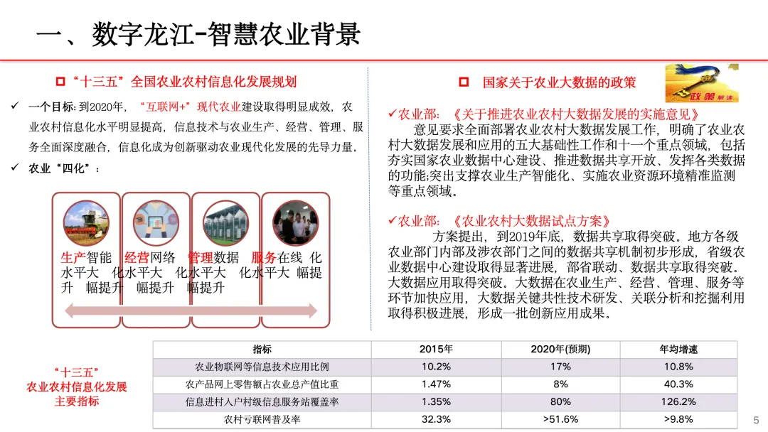 自 2004 年以来,中央一号文件连续聚焦”三农”问题,近三年更是重点推进农业科技创新和乡村振兴。农业农村部相继出台《农业农村大数据试点方案》《关于推进农业农村大数据发展的实施意见》等政策文件,明确提出到 2020 年”互联网+”现代农业建设取得明显成效,信息技术与农业生产、经营、管理、服务全面深度融合的目标。