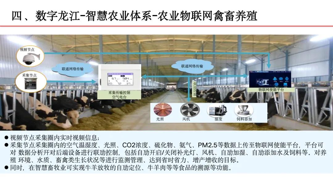 畜禽养殖自动化:监测圈舍内的温湿度、光照、氨气浓度等指标,自动控制补光、通风、加湿、喂料等设备,同时实现牛羊放牧的自动定位和畜产品溯源。