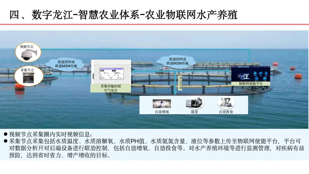 水产养殖智能化:实时监测水温、溶解氧、PH 值、氨氮含量等水质参数,自动增氧、投食,有效预防疾病,实现增产增收。