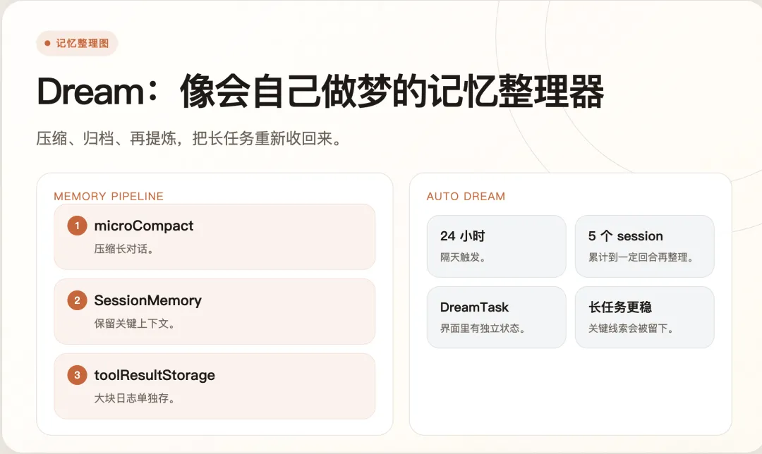 SessionMemory 里的 session,就是一次连续工作过程;toolResultStorage 的意思,是把测试日志、搜索结果、命令输出这些大块内容单独存起来,不全塞进聊天上下文里;autoDream 则更像一个“会自己做梦”的模式。用户停下来之后,它会把前面零散的对话、文件改动、命令结果重新收拢、压缩、归档,像人睡觉时把白天的信息重新整理进记忆里。