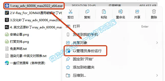 2.打开刚刚解压的文件夹,找到安装的3dsMax对应版本,如选中【1.vray_adv_60006_max2022_x64】,鼠标右键点击【以管理员身份运行】