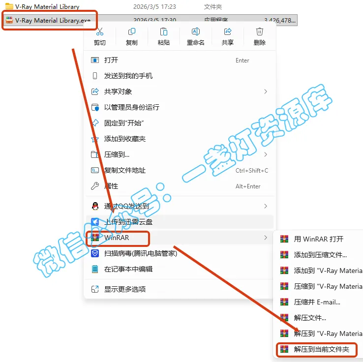 13.选中下载的【V-Ray Material Library】压缩包,鼠标右键选择【解压到当前文件夹】