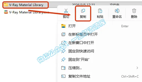 14.选中解压出来的【V-Ray Material Library】文件夹,鼠标右键选择【复制】