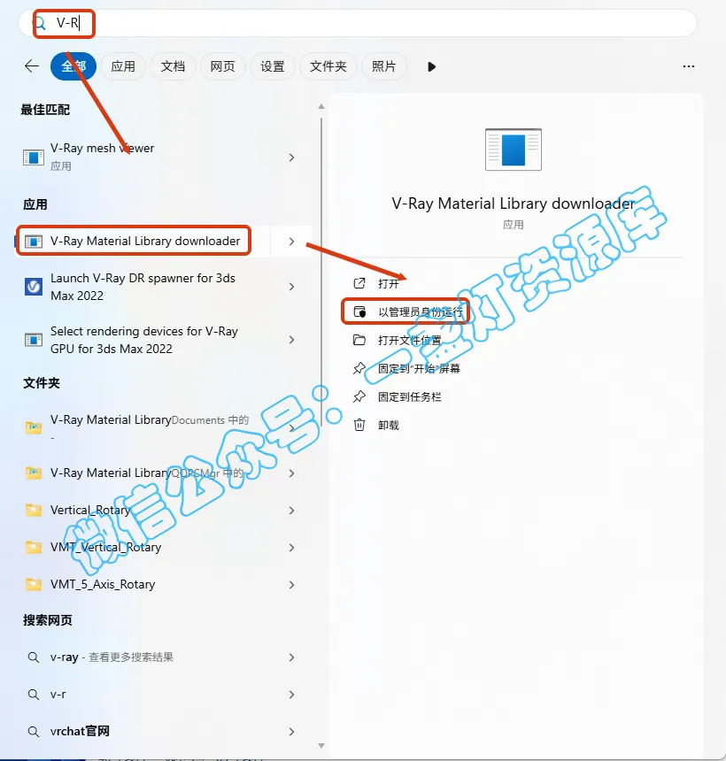 16.点击桌面任务栏中的【开始图标】,在搜索栏中搜索【V-Ray Material Library downloader】文件夹,点击【V-Ray Material Library downloader】选择【以管理员身份运行】