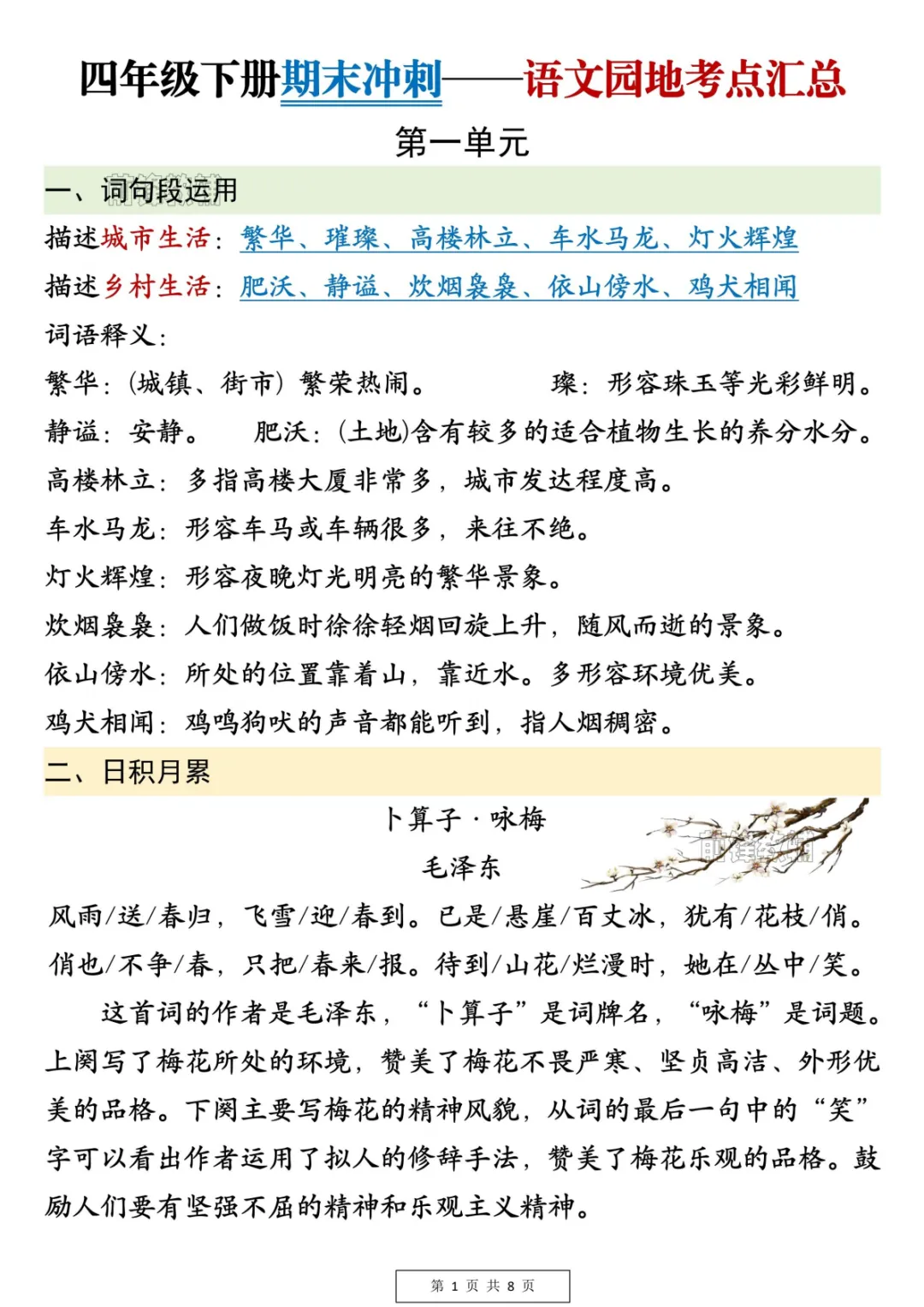 四年级下册语文园地考点汇总;有完整电子版可打印!