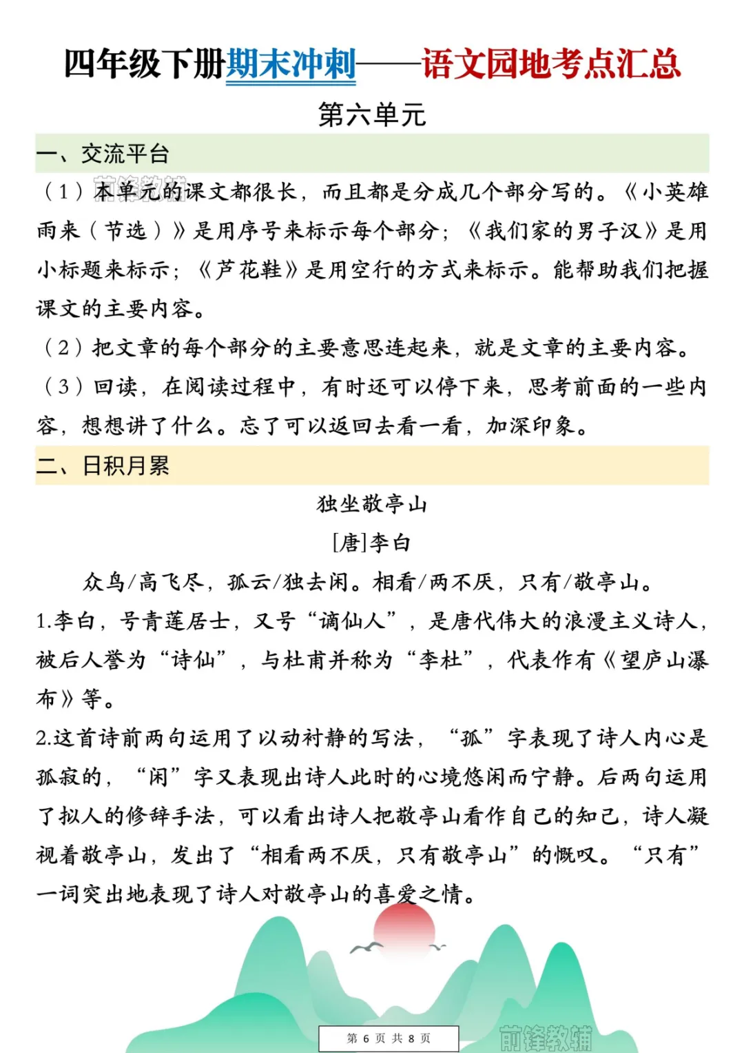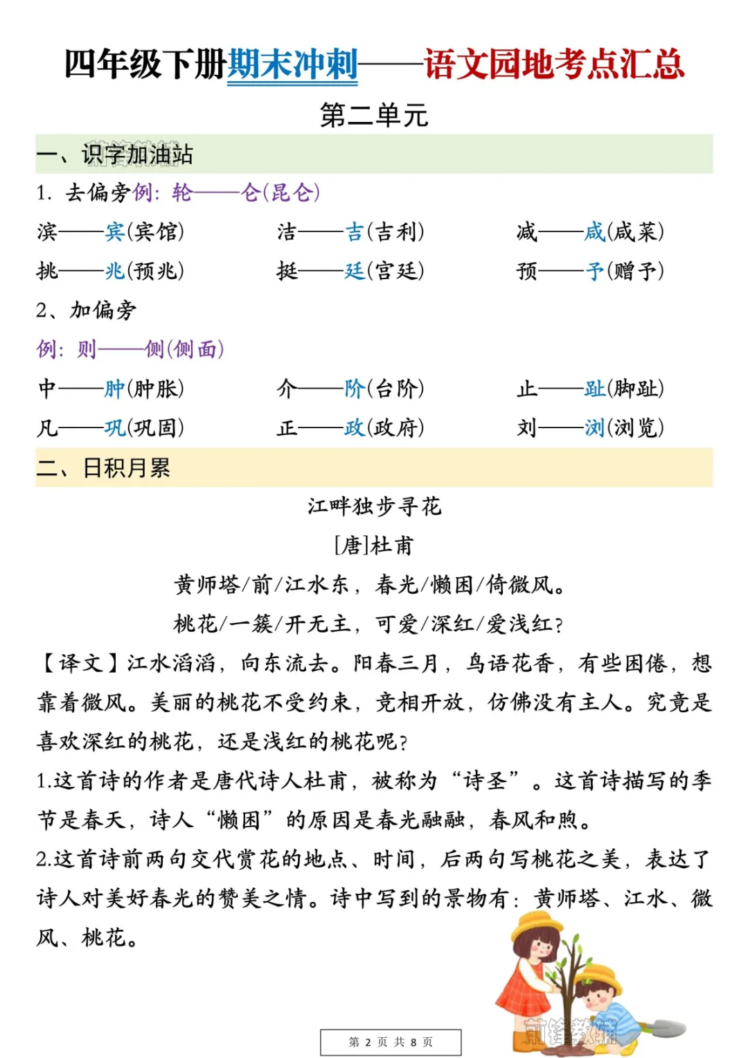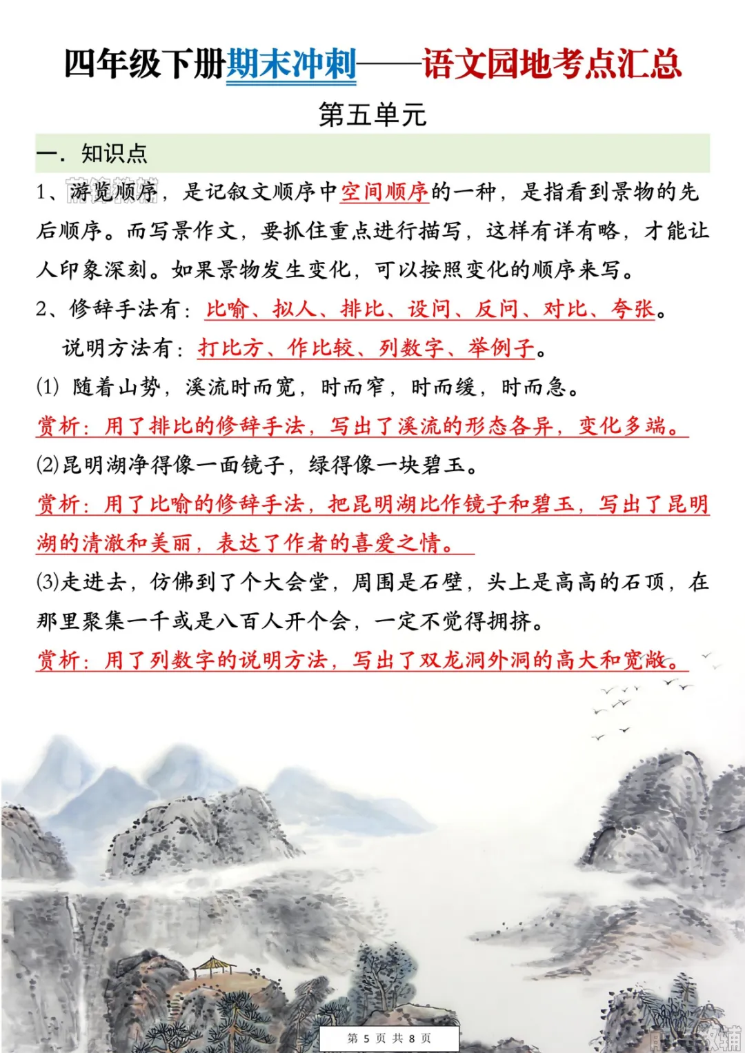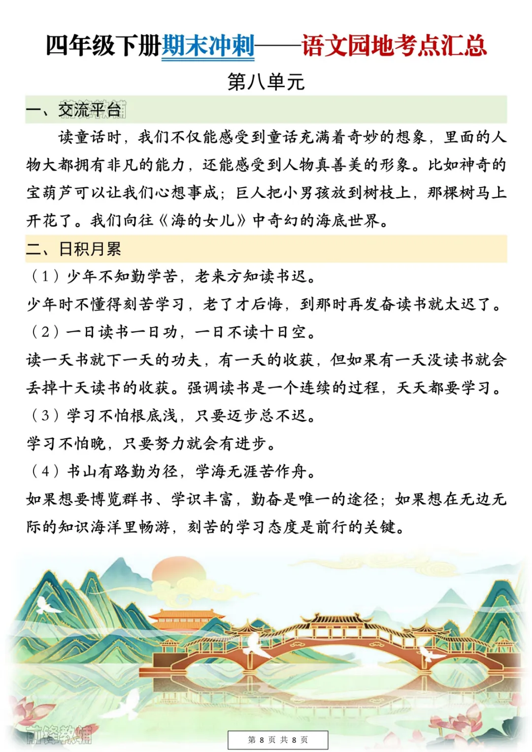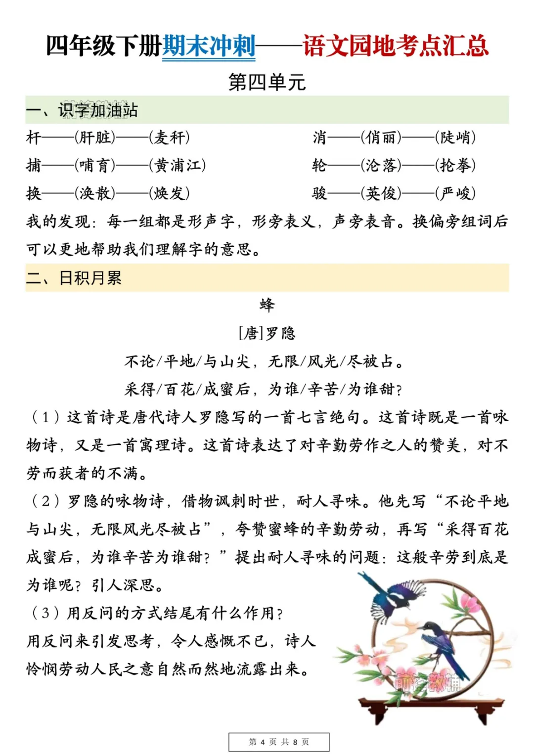 今日分享四年级下册语文园地考点汇总;有完整电子版可打印!下滑到文末有领取方式🌹