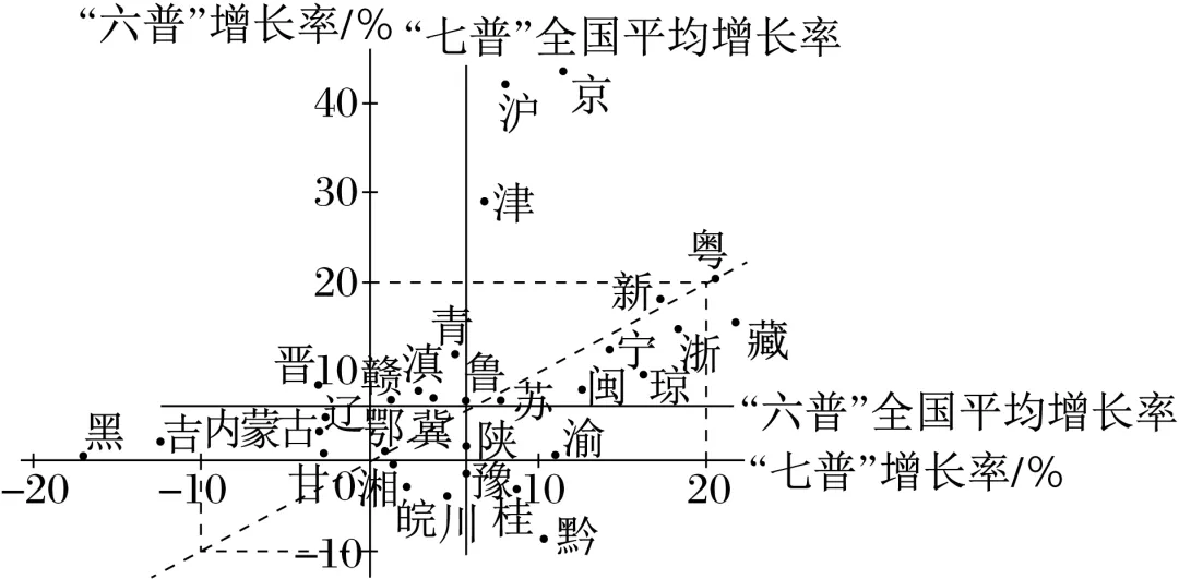 (2022·江苏卷)我国于2010年和2020年分别进行了第六次全国人口普查(“六普”)、第七次全国人口普查(“七普”)。下图为我国大陆31个省、自治区、直辖市“六普”“七普”人口增长差异图。据此完成8~10题。
