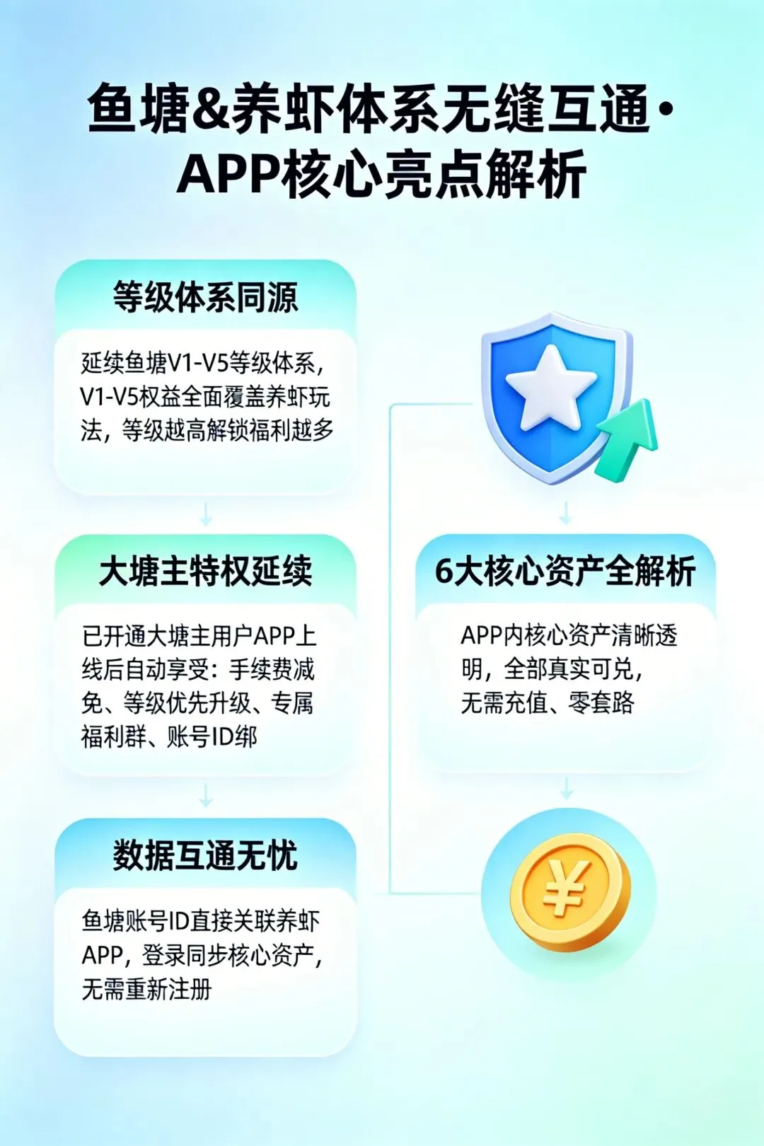 :你的鱼塘账号 ID 直接关联养虾 APP,登录即可同步核心资产,不用重新注册,省心又快捷!