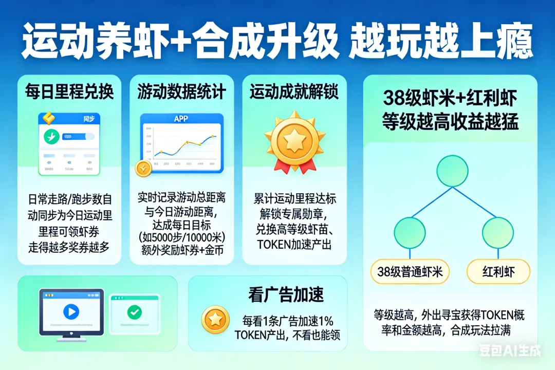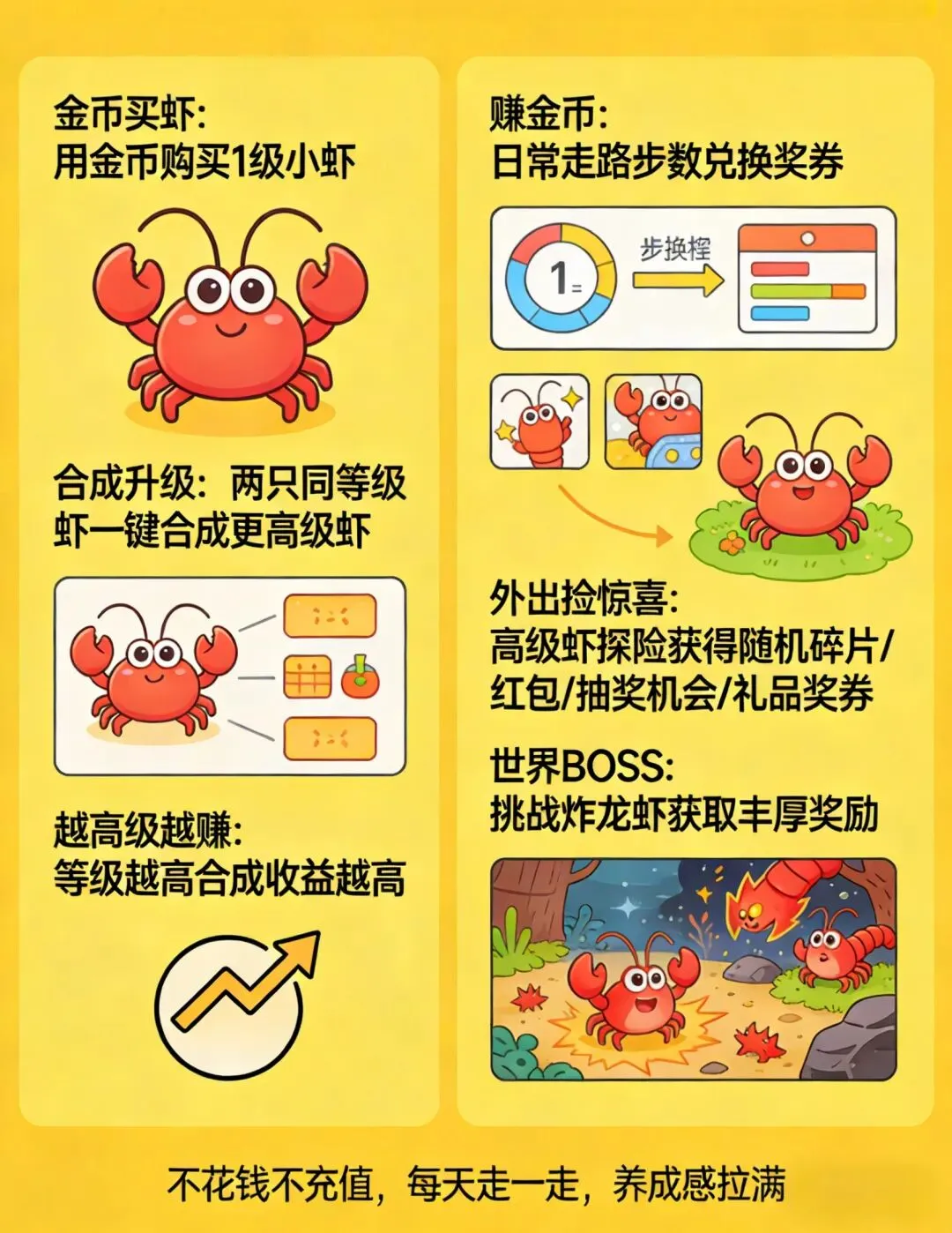🎮 核心玩法:运动养虾 + 合成升级,越玩越上瘾