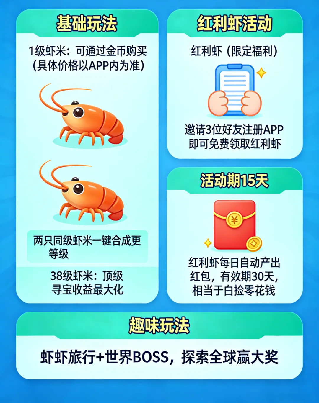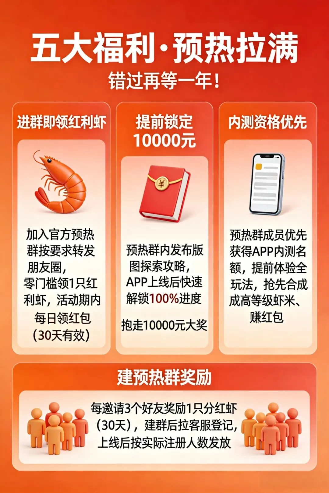 ✅ 内测资格优先:预热群成员优先获得 APP 内测名额,提前体验全玩法,抢先合成高等级虾米、赚红包!