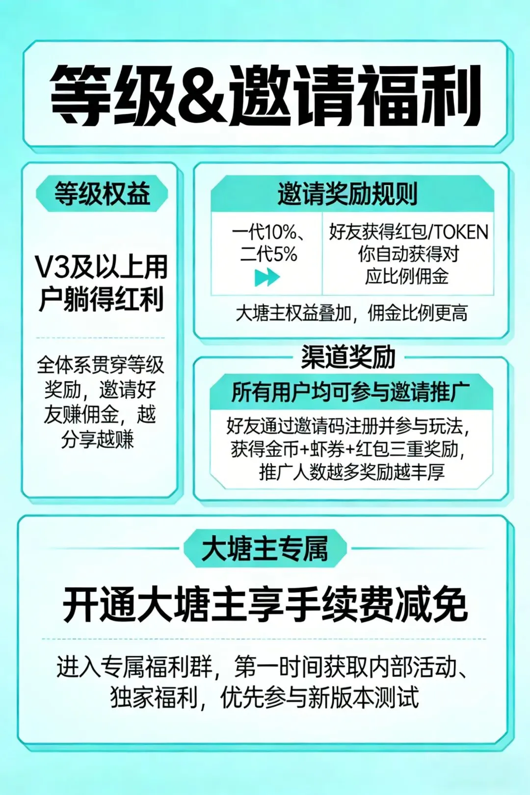 :V3 及以上用户,享受专属特权 ——邀请好友奖励一代 10%、二代 5%(好友获得红包 / TOKEN,你自动获得对应比例佣金),大塘主权益叠加,佣金比例更高! - 渠道奖励(邀请制)