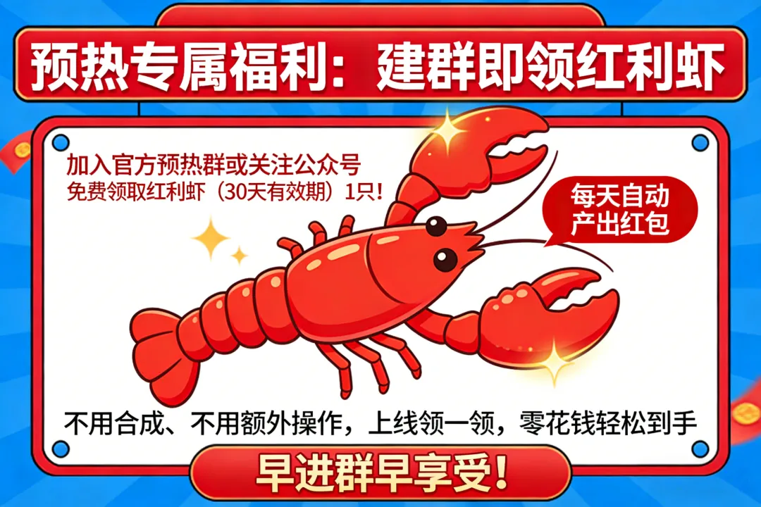 ✅ 进群即领红利虾:加入官方预热群按照活动要求转发朋友圈,零门槛无需充值,免费领红利虾 1 只,活动期内每日领红包,30 天有效期稳稳!