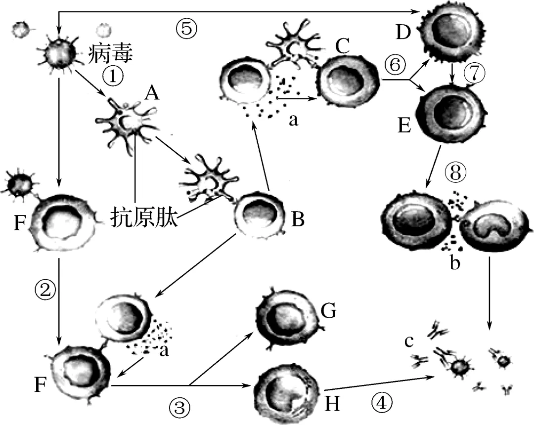 (4)a为细胞因子,则细胞B、F、C分别为辅助性T细胞、B细胞和细胞毒性T细胞,图中记忆细胞为D、G。