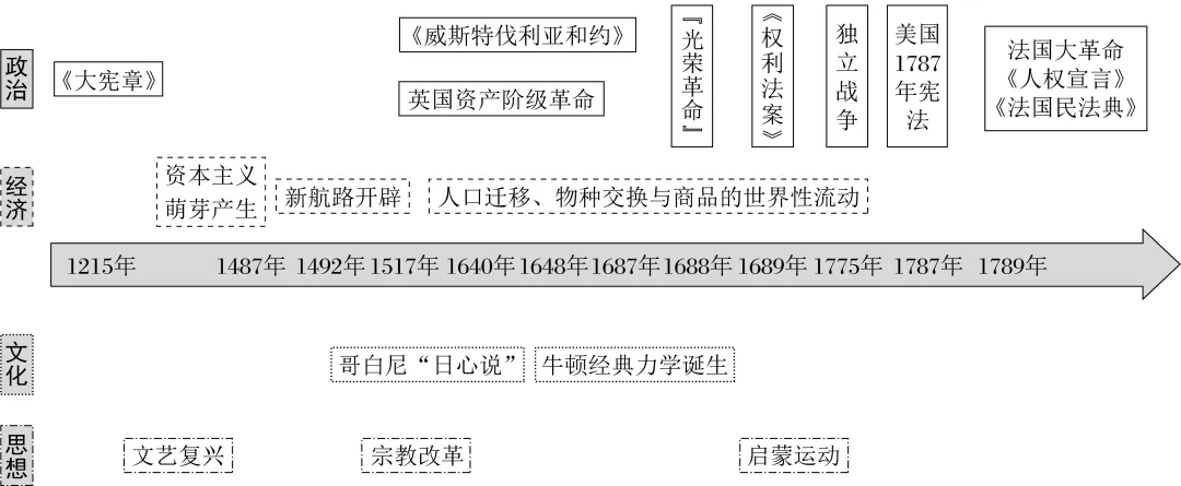 14、15世纪—18世纪中期是世界从封建社会向资本主义社会过渡的时期,这一时期,在经济、思想文化、政治等领域发生了深刻的变化,资本主义制度逐步确立起来 |