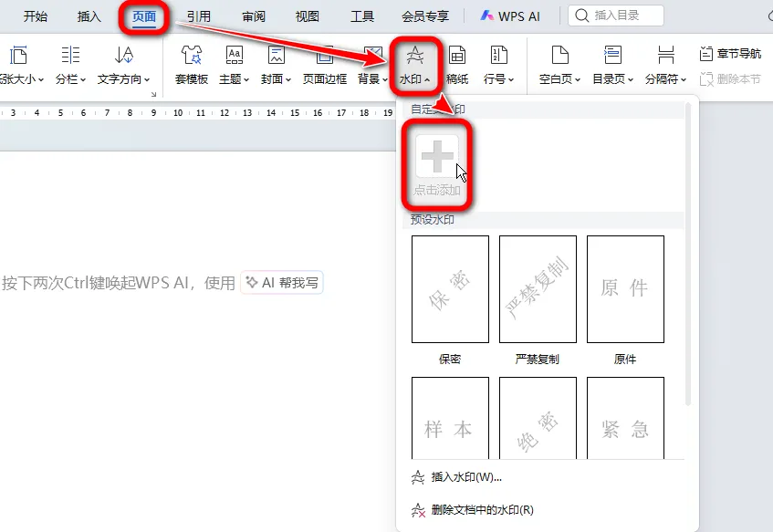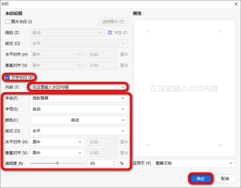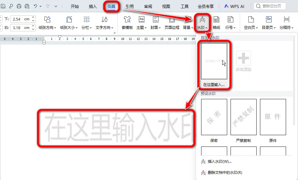 Word添加文字水印详解,轻松打造专属文档标识 给Word文档中添加文字水印,下面介绍具体的操作步骤。 第一步: 点击「页面」选项卡,选择功能区中的「水印」。 选择「自定义水印」中的「点击添加」。 第二步: 在「水印」对话框中,勾选「文字水印」。 在「内容」文本框中输入需要的文字,并对文字的格式进行设置。 全部设置完成后点击「确定」保存。 第三步: 此时只是创建了一个自定义文字水印,还没添加到文档中。 再次点击功能区中的「水印」,选择刚才创建好的水印,此时水印就被添加到文档中啦! 就这么简单,搞定啦!赶紧动手试试吧!