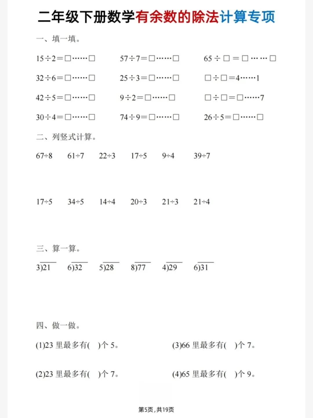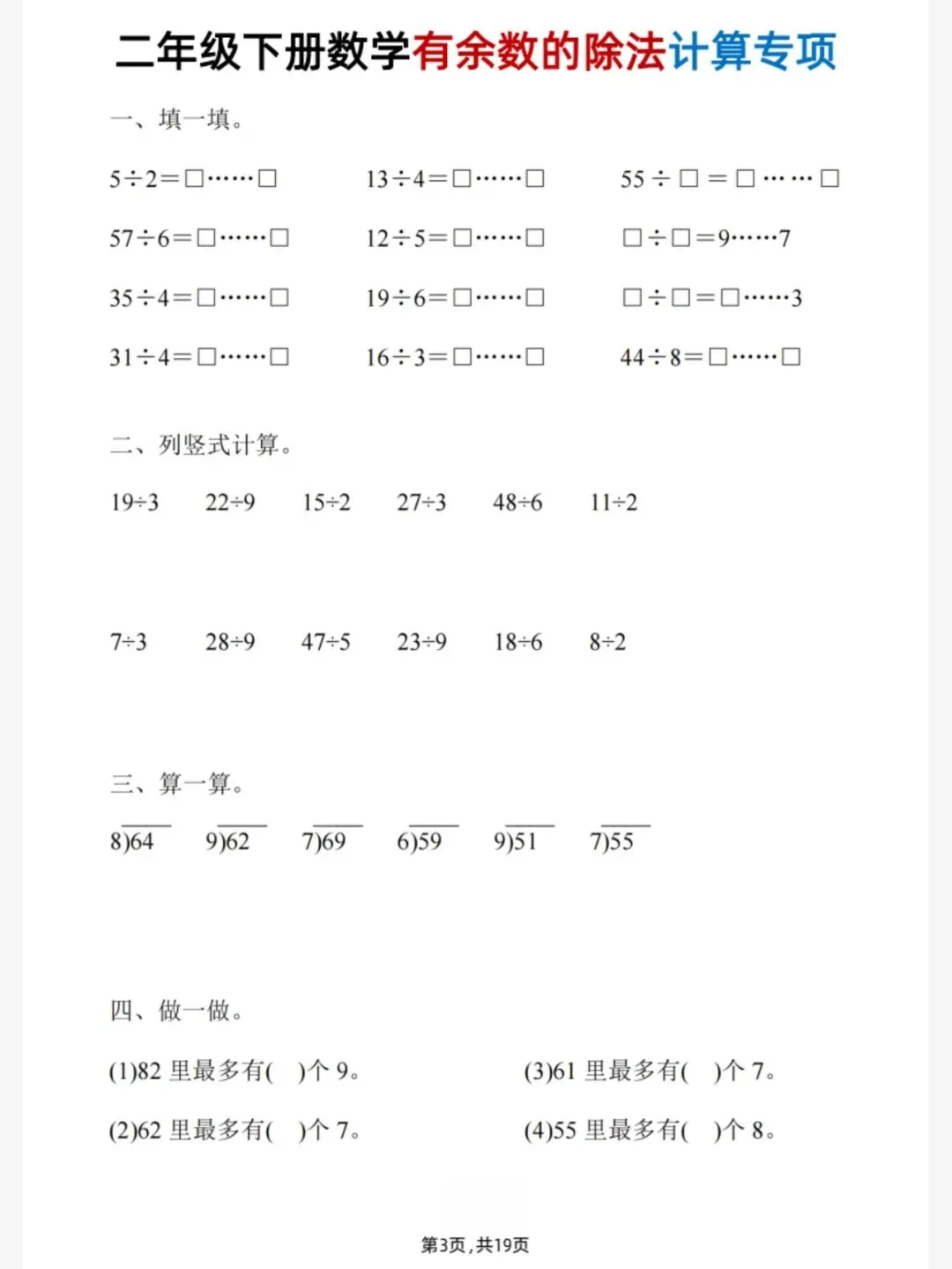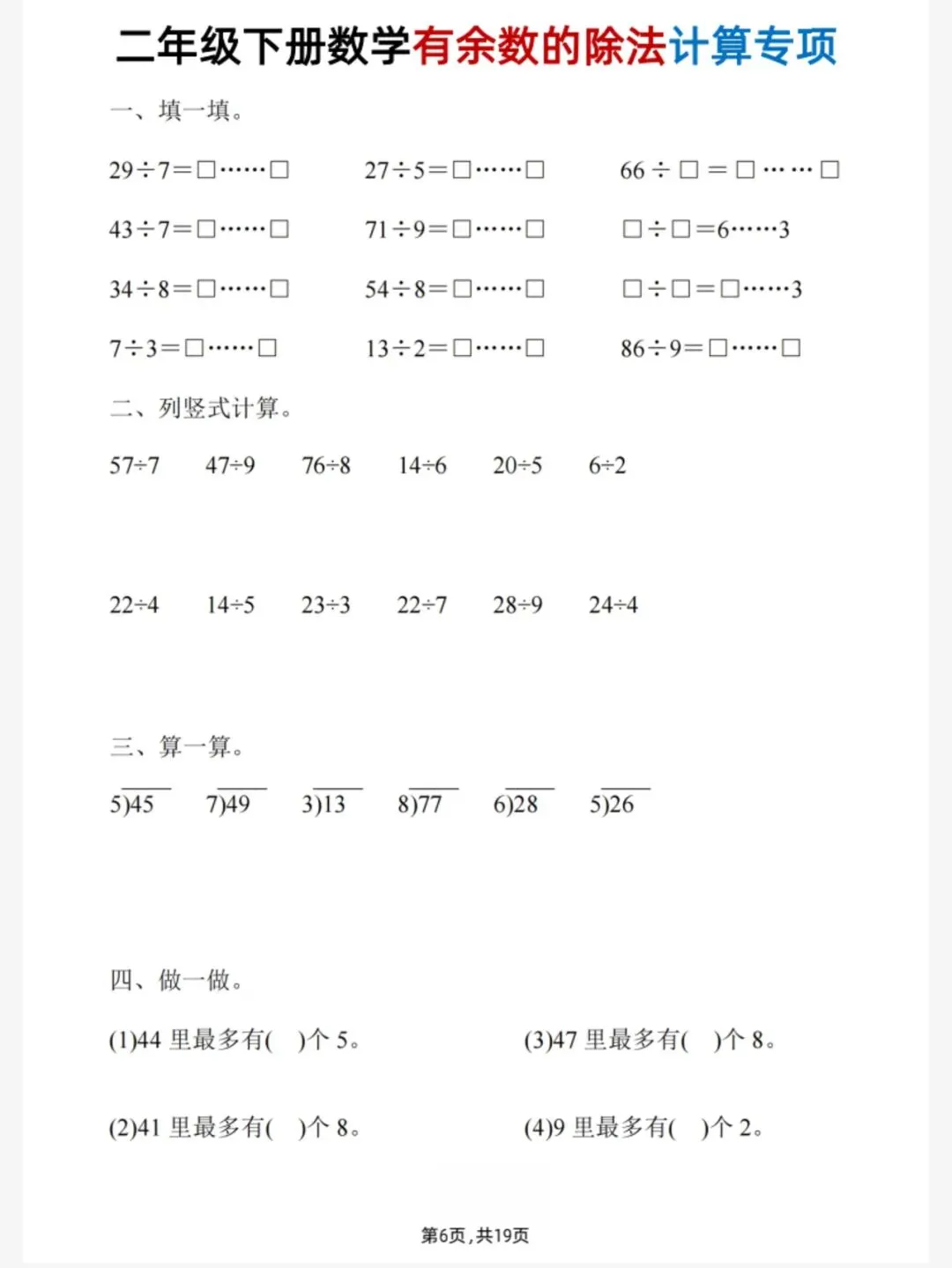今天给大家分享:二年级下册数学有余数的除法计算专项,一共19页。