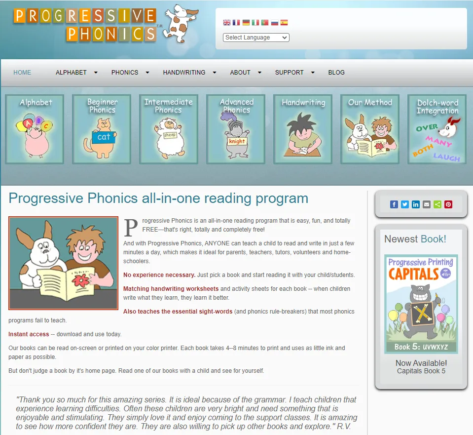 Progressive Phonics 提供 完全免费 的自然拼读学习资源,包括初学者、中级和高级学习者的分级教材。