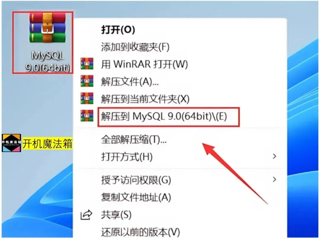 1、下载MySQL 9.0软件安装包到电脑上,右键选择【解压到当前文件夹】。