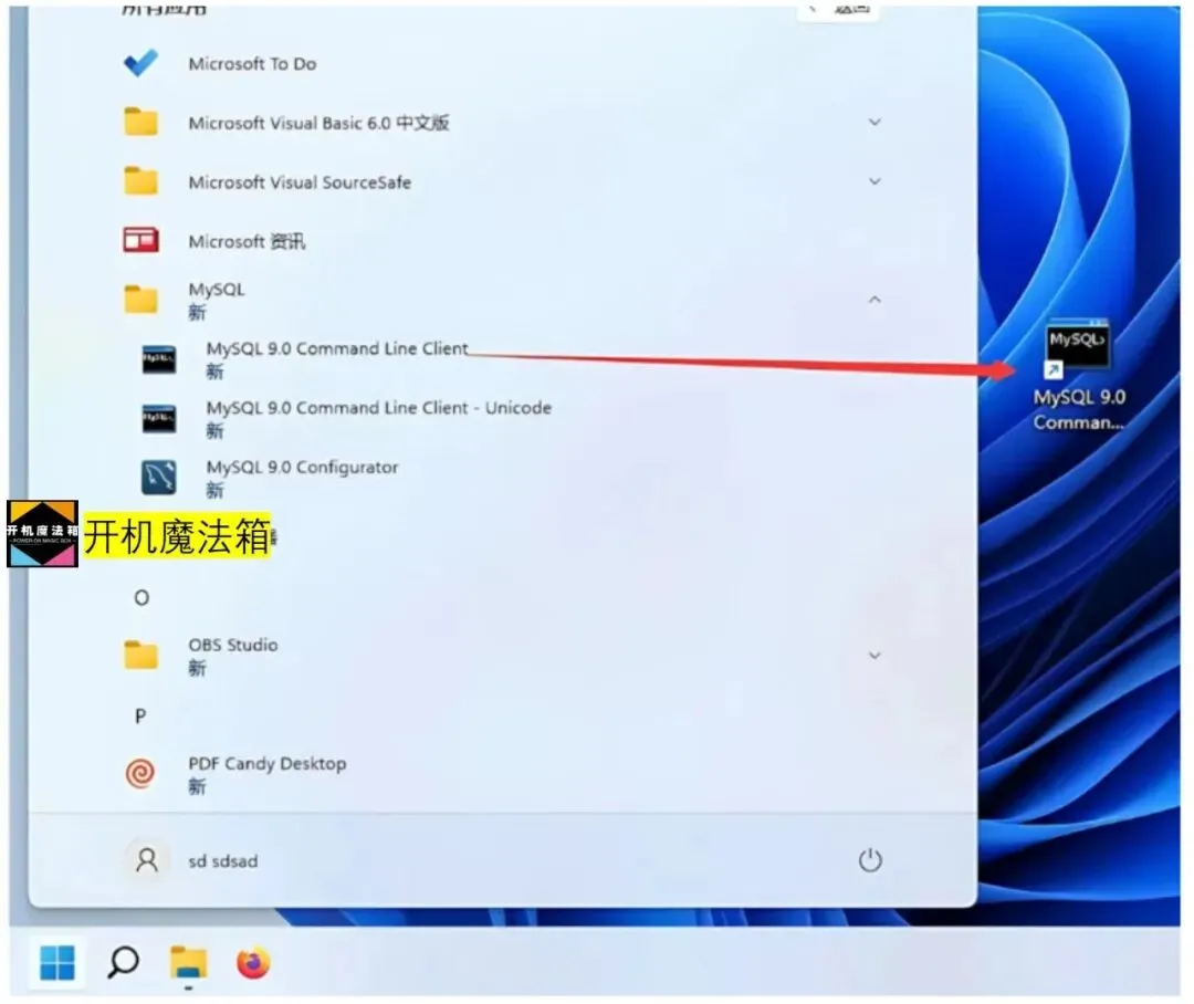 20、创建桌面快捷方式:①点击桌面任务栏中的【开始图标】>点击【所有应用】>双击展开【MySQL】文件夹②将【MySQL 9.0 Command Line Client】图标拖到电脑桌面。