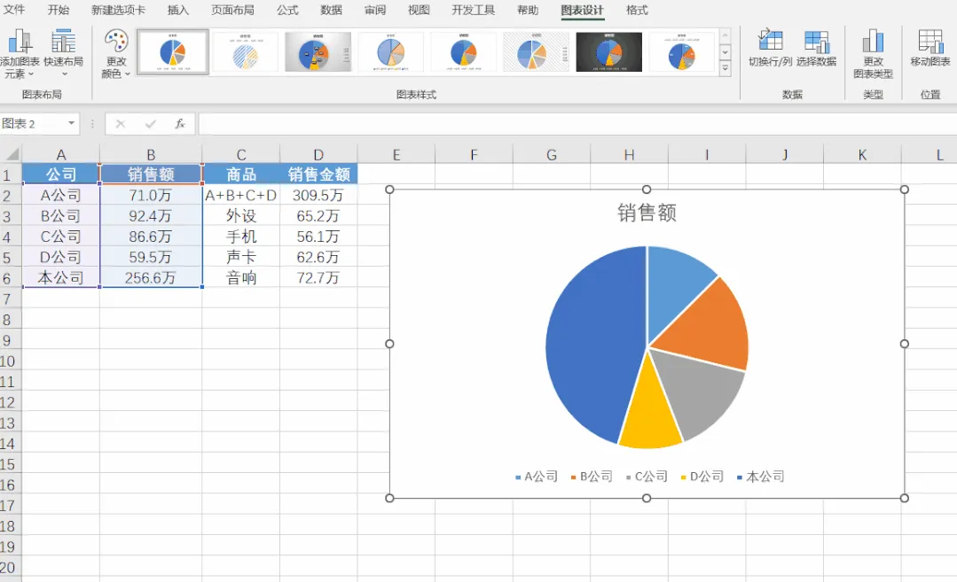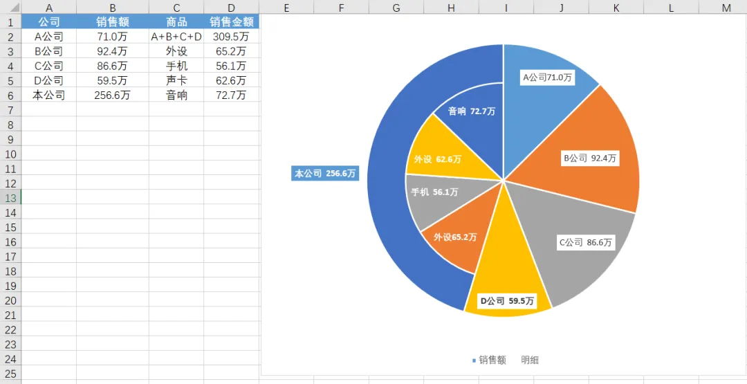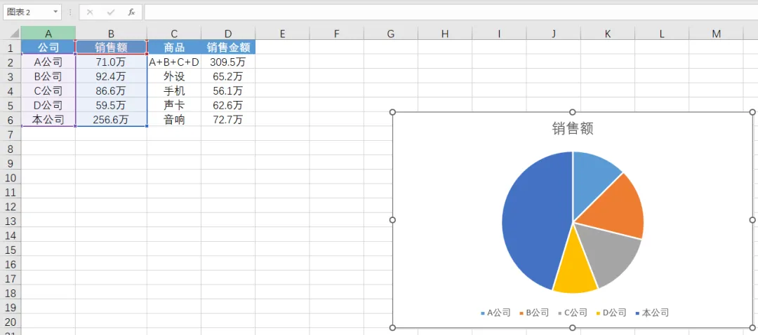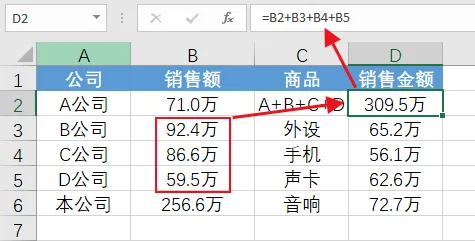 D2单元格将A、B、C、D公司的销售额进行汇总。
