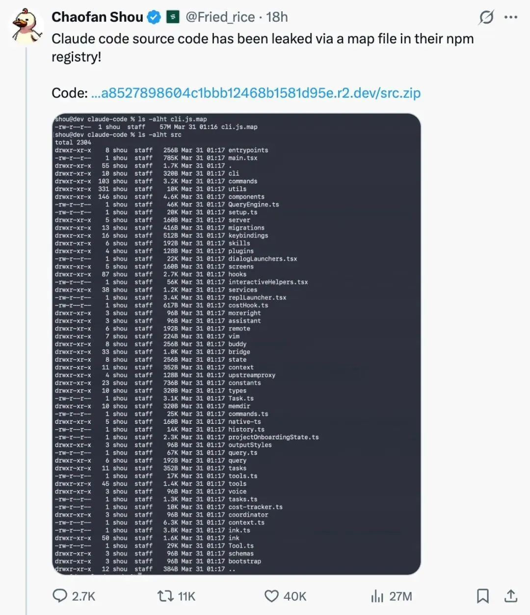区块链安全公司 Fuzzland 的实习研究员 Chaofan Shou 在 X 平台上发布了一条简短却震撼的消息:“Claude Code 源码通过 npm 注册表中的 map 文件泄露了!”短短几小时内,这条推文获得了超过 2200 万次浏览。