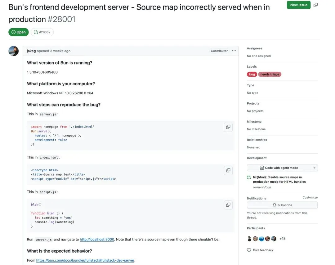 问题的根源可能指向一个更深层的技术债务。Claude Code 是基于 Bun 运行时构建的——而 Anthropic 在 2024 年底刚刚收购了 Bun。根据多位开发者的分析,Bun 的打包工具默认会生成 source map,除非显式关闭。更关键的是,GitHub 上早在 3 周前(3 月 11 日)就有开发者报告了 Bun 的一个 bug(issue #28001):source map 在生产模式下仍然会被暴露,尽管官方文档声称应该禁用。