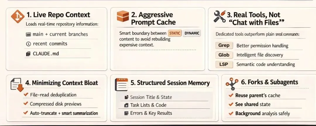 小结: 这 6 个杀手锏共同构成了 Claude Code 的技术护城河。它们不是孤立的功能,而是一个精心设计的系统:实时上下文提供“感知能力”,缓存优化提供“效率”,专用工具提供“执行能力”,上下文压缩提供“记忆容量”,结构化记忆提供“长期知识”,并行机制提供“多任务能力”。