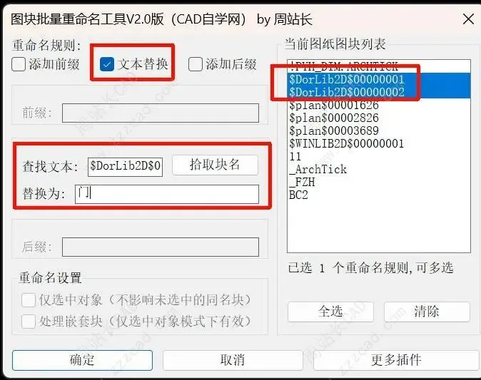 勾选文本替换,选中列表两个图块,他会自动提取公共部分填入查找文本,替换为写上门,这样块名就剩门1、2了。