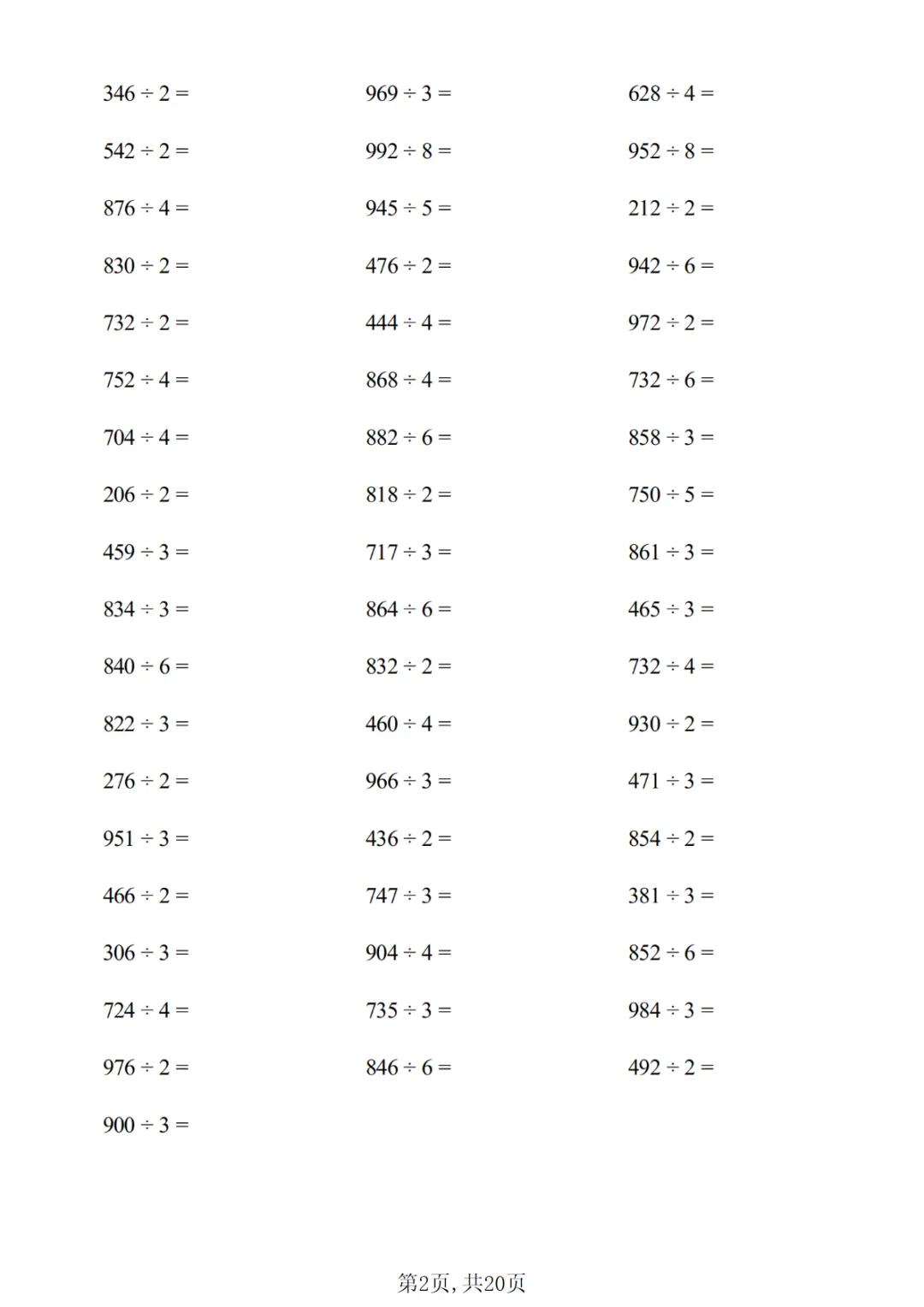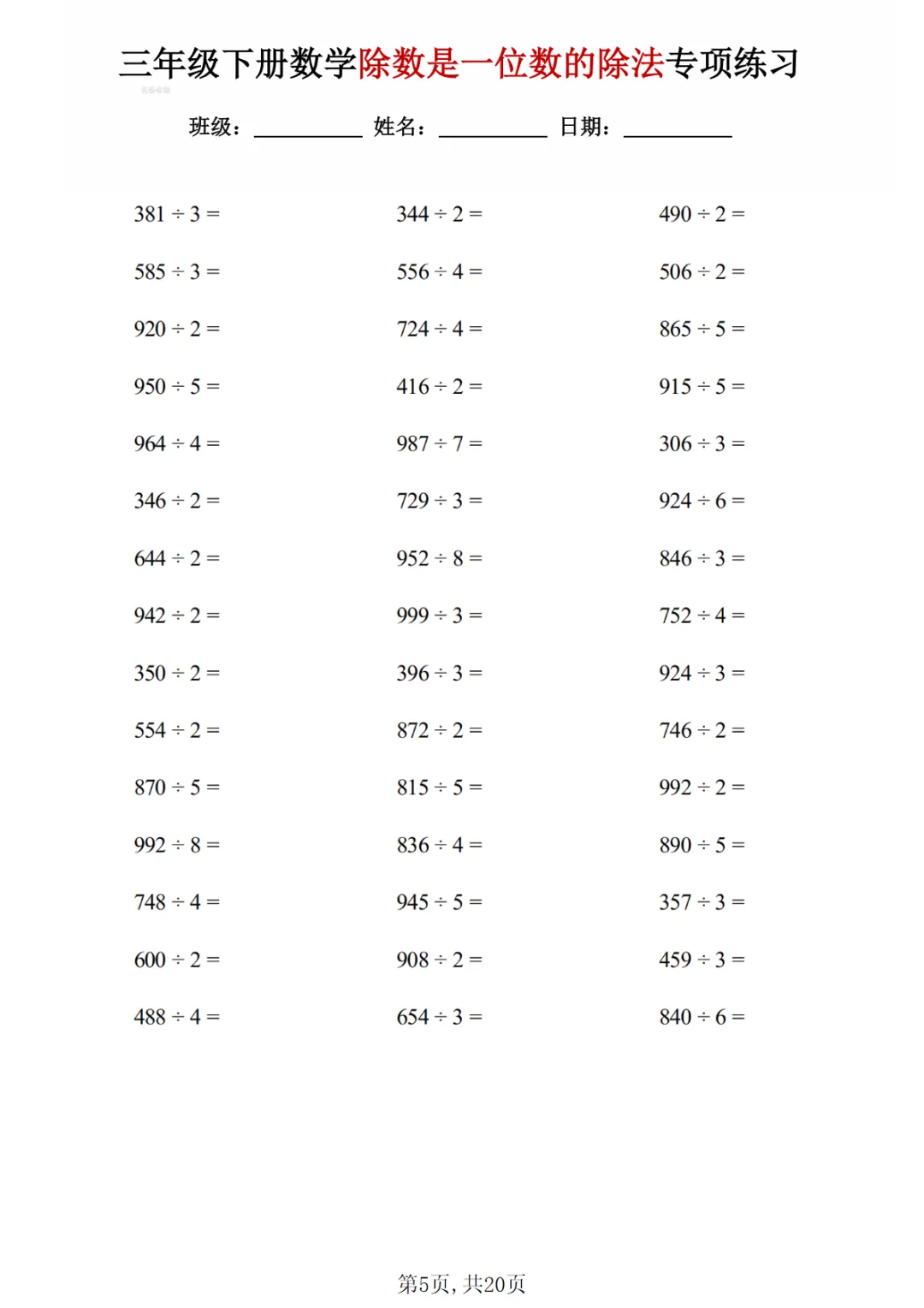 【免费下载】三年级(下)数学 除数是一位数的除法专项练习1PDF高清电子版,可打印,先保存后下载