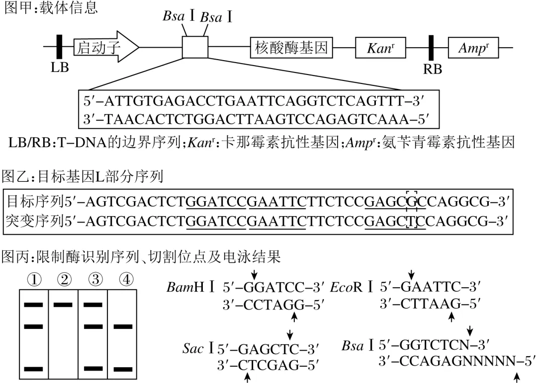 【典题引领】(2024·山东卷)研究发现基因L能够通过脱落酸信号途径调控大豆的逆境响应。利用基因工程技术编辑基因L,可培育耐盐碱大豆品系。在载体上的限制酶BsaⅠ切点处插入大豆基因L的向导DNA序列,将载体导入大豆细胞后,其转录产物可引导核酸酶特异性结合基因组上的目标序列并发挥作用。载体信息、目标基因L部分序列及相关结果等如图所示。