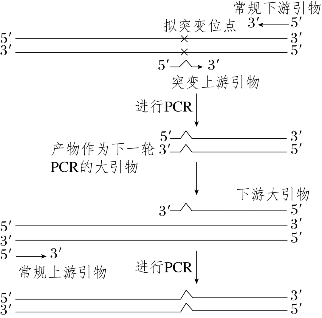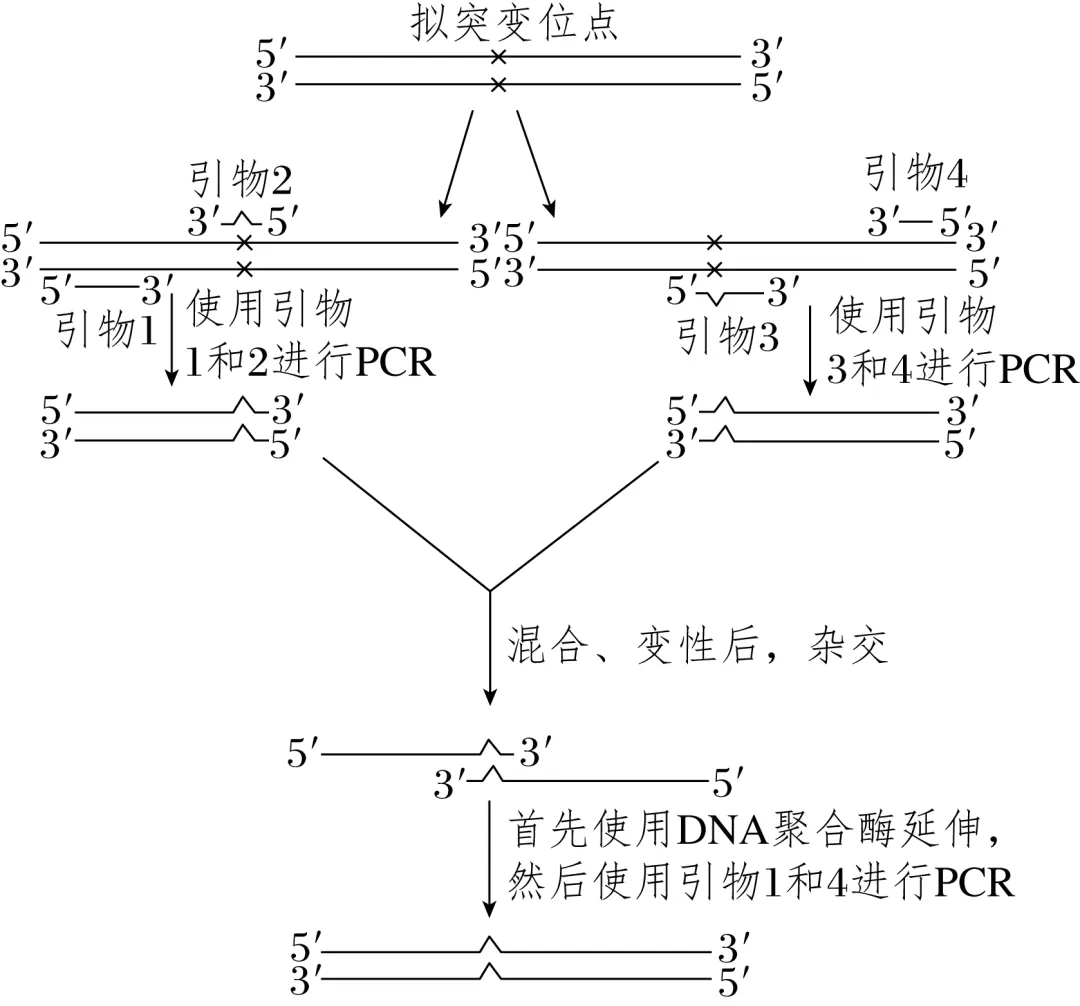 3.重叠延伸PCR是一种PCR定点突变技术。该技术要使用四条引物(如图所示),其中引物2和3的突起处代表与模板链不能互补的突变位点,而这两条引物有部分碱基(包括突变位点)是可以互补的。因此,分别利用引物1和2、引物3和4进行PCR后,得到的DNA片段可以通过引物2和3互补的碱基杂交在一起,再在DNA聚合酶的作用下延伸,就能成为一条完整的DNA片段。最后,用引物1和4进行扩增得到含有突变位点的DNA片段。