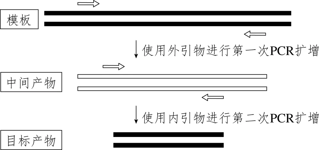 5.巢式PCR是一种变异的聚合酶链式反应(如图所示),使用两对(而非一对)PCR引物扩增完整的片段。第一对PCR引物扩增片段和普通PCR相似。第二对引物称为巢式引物(因为它们在第一次PCR扩增片段的内部),结合在第一次PCR产物内部,使得第二次PCR扩增片段短于第一次扩增。巢式PCR的好处在于,如果第一次扩增产生了错误片段,则第二次能在错误片段上进行引物配对并扩增的概率极低,巢式PCR的扩增特异性更强。