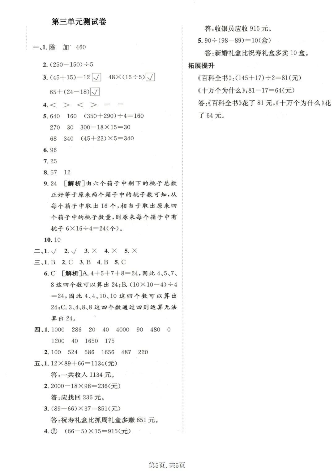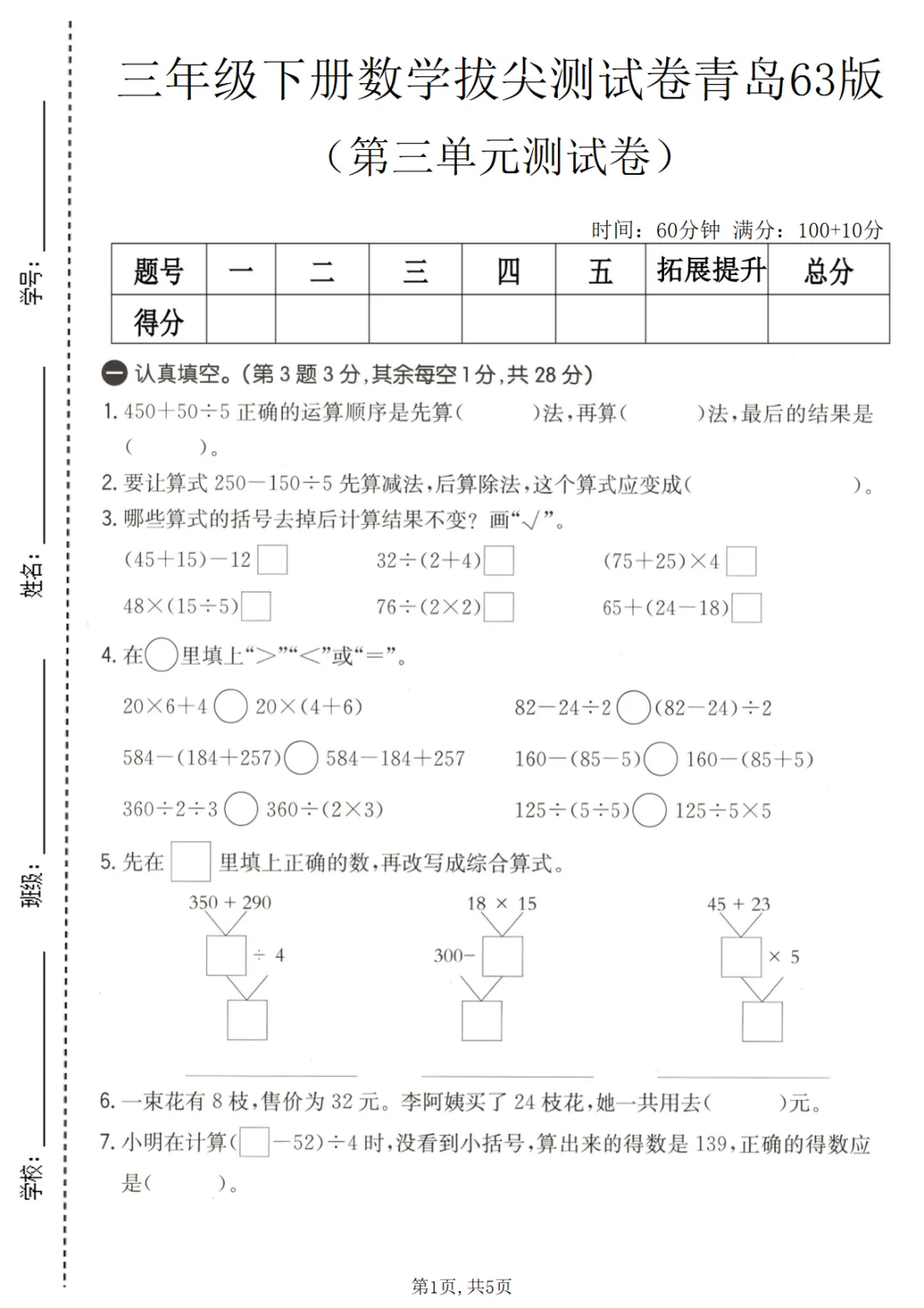 【免费下载】三年级(下)数学 第三单元拔尖测试卷《青岛63版》(1)PDF高清电子版,可打印,先保存后下载